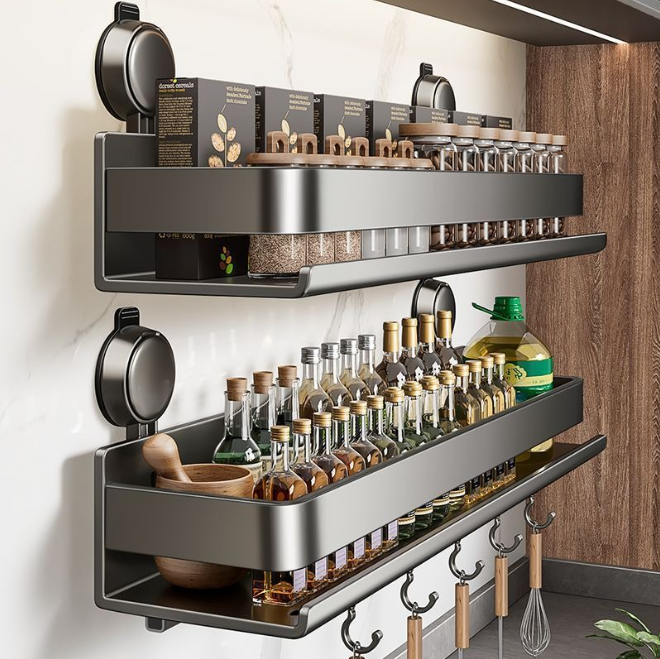 蓝藤吸盘厨房置物架免打孔家用壁挂式调料用品墙上多功能收纳架子 吸盘式单层 枪灰色 30cm